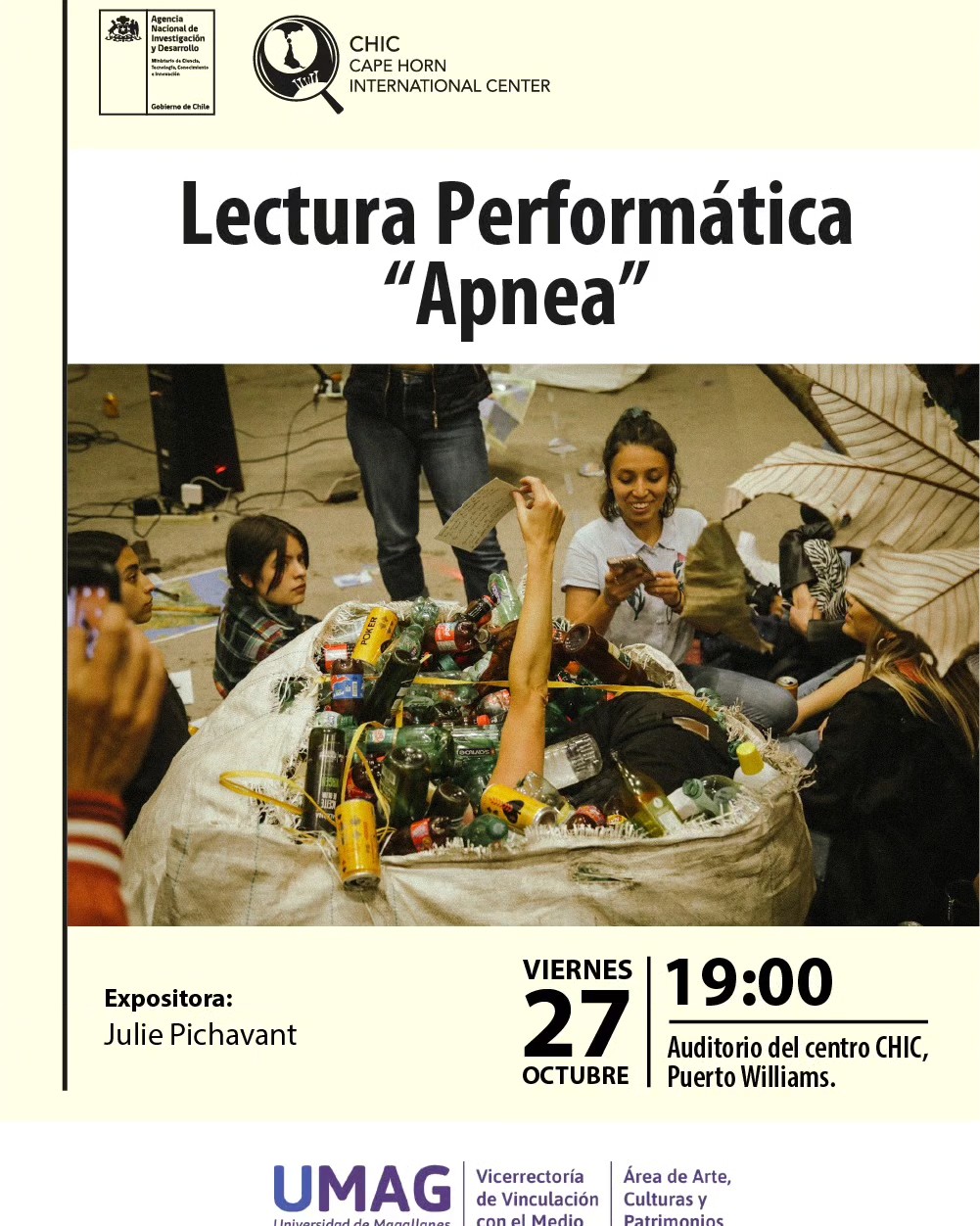 La artista francesa Julie Pichavant presentará su performance « APNEA » en el auditorio del Centro CHIC (Puerto Williams), mañana viernes 27 de Octubre a las 19:00 hrs. Se trata de una pieza que tiene como temática la depredación y la contaminación del mar, nacida de una residencia que la actriz y escritora cursó hace dos años en Magallanes, gracias al apoyo de la UMAG, el Goethe Institut y el Instituto Francés.