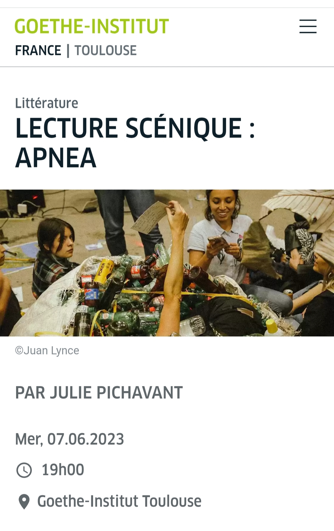 Además, la actriz realizó una itinerancia en conjunto con la actriz Nitzamé Mayorga Gallardo con su performance “Apnea”, presentándose en Punta Arenas (Universidad De Magallanes), Puerto Williams (Liceo “Donald Mctyre” y en el Centro Subantártico Cabo de Hornos) y en Porvenir, en el Teatro “Cinema Porvenir” y en el Liceo Polivalente “Hernando de Magallanes”. Esta obra, que habla sobre la contaminación marina y la depredación humana de los ecosistemas, es el producto de la residencia artística “Emergencias del Bentos”, realizada en 2021 por la Vicerectoría de Vinculación con el Medio UMAG y en donde compartió con la artista visual chilena residente en Alemania Michelle-Marie Letelier y la artista escénica magallánica Karen Reumay. Julie Pichavant también participó de la reciente residencia “Tiempo profundo”, desarrollada recientemente por la UMAG en Porvenir, junto a estudiantes, artistas e investigadores de la casa de estudios.
