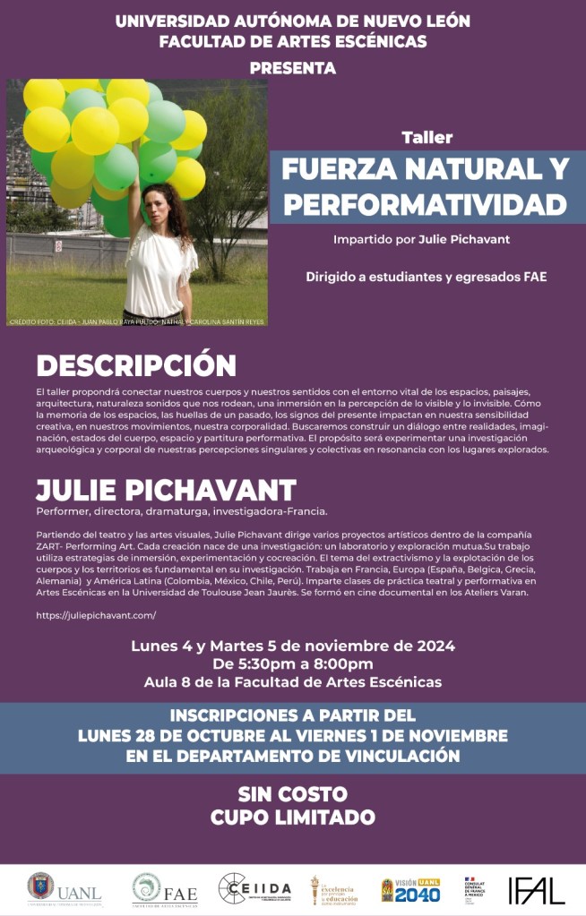 Taller « Fuerza Natural y Performatividad » , Facultad de Artes Escénicas UANL, residencia de investigación artística en el CEIIDA, Centro de Investigación, Innovación y Desarrollo de las Artes de la Universidad Autónoma de Nuevo León – 4 y 5 de noviembre de 2024